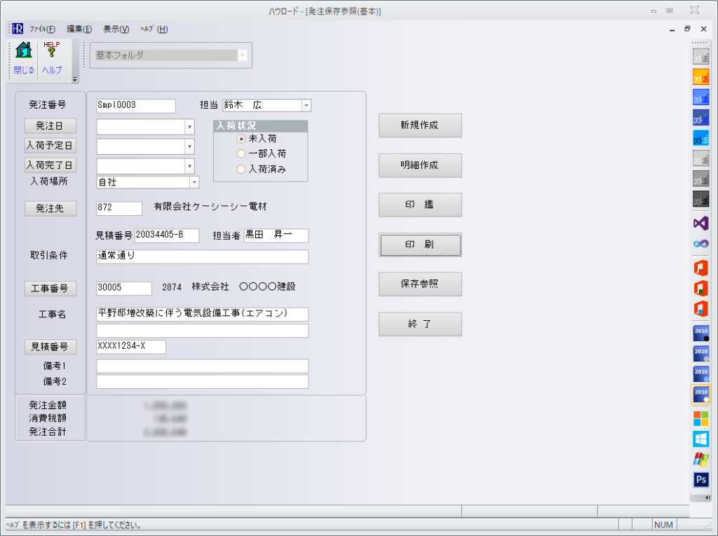 ハウロードシリーズでは、見積で入力した材料名・数量・単価・取引先情報 を、そのまま発注書へ自動転用できます。